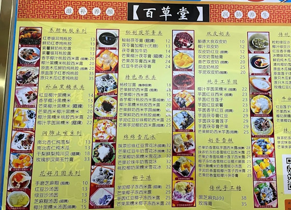 | さて、百草堂一番の人気商品は楊枝甘露。どうですか、食欲そそられますか。この店はメニューが多いのでいろいろ挑戦したい気持ちもあるけど、やっぱり楊枝甘露を注文してしまう回数が多いですね。 百草堂があるエリアは、蛇口の中でも最も早く開発された1990年代から人が住み着いたエリアで、主として香港から来た人が多かったようです。そうした地元の人たちに長く愛されてきている味です。私も8年間お世話になっている味です。2026年1月現在18元という庶民的な価格で提供してくれています。 |