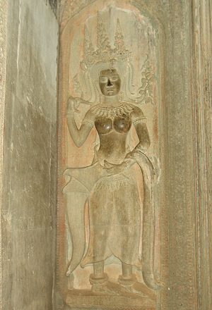 | アンコールワットには無数のデバターが描かれています。デバターは女官や踊り子たちを描いたレリーフです。デバターがいくつあるのか分かりませんが、すべて実在のモデルがいたと言われ、一つとして同じデバターはありません。デバターの躍動感ある姿はアンコールワットの魅力の一つです。 |