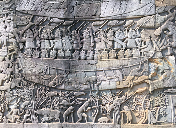 上のレリーフはトンレサップ湖での戦いです。船に乗っているのはチャンパ軍兵士です。トンレサップ湖での戦いは、クメール軍とチャンパ軍との戦いの中でも激戦として知られていて、ここでの戦いに勝利したことが、チャンパを破る大きなきっかけになったのです。 |