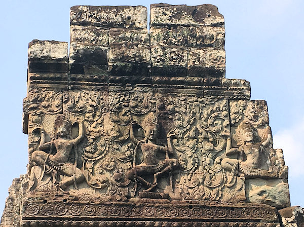 上の写真は戦闘の場面です。クメール軍は左から右に攻めています。倒れているのは敵兵チャンパの軍隊で、クメール軍の強さと勇ましさを描いています。 |