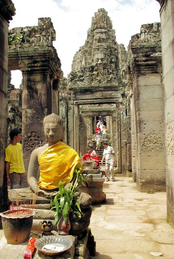 第一回廊から中央祠堂を見たところに、今も多くのカンボジアの人々がお参りする仏像があります。私はここの景色が好きで、いつもこの場所で時間を暫く費やしてしまいます。もともとは回廊に屋根があって中央祠堂が見えなかった場所なのでしょうが、回廊に屋根のない今はかえってその柱だけの回廊と威厳のある中央祠堂を同時に見ることのできる場所として、何か寂しさも無常さもそして荘厳さも感じさせてくれる場所なのです。 |