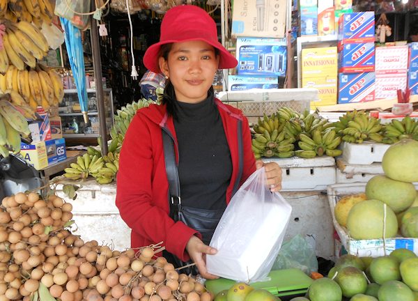 皮をむいて、食べやすいサイズに切って、パックに入れてもらって、パックを受け取ろうとしたら、若くてきれいな女性でした。 フルーツについては、シェムリアップではシヴォタ通りにあるラッキースーパーでカットしたものがパックに入って売られていますから、そうしたスーパー等で買うこともできるのですが、せっかくですから地元人たちが通うマーケットで購入してみるのもいかがでしょうか。良い旅の思い出になると思います。 |