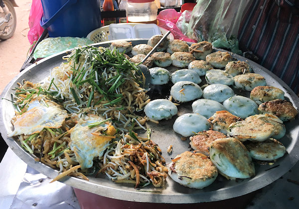 | プサールーマーケットはシェムリアップの人たちが一番多く集まるマーケットですから、B級グルメの屋台もたくさんあります。プサールーマーケットの入口付近でフルーツショップやパン屋などを冷やかしたら、建物の周りを時計と反対側方向に歩いていけば、生鮮品のお店やB級グルメの店が数えきれないほど並んでいます。どこもお客さんで賑わっています。 |