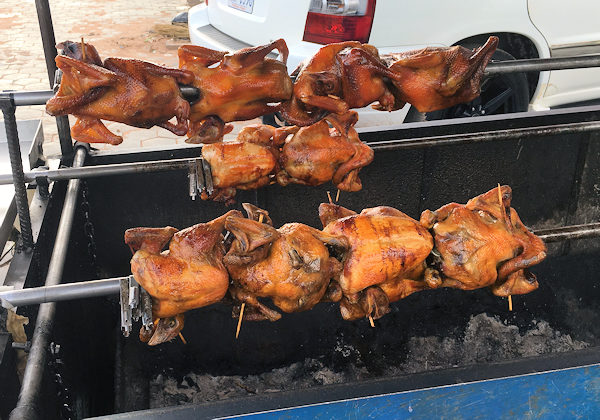 | よだれが出そうなグリルチキンです。残念なことにこの屋台には誰も店員がいなくて買えません。3分くらい待ったのですが、誰も戻ってこないのです。買うのをあきらめて次の店を探すことにしました。 |
