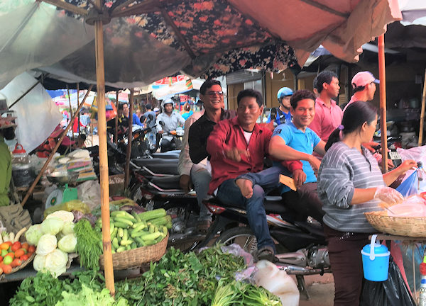 | 野菜屋の横にたむろっているのは、きっとバイタクのお兄さんたちです。このマーケットにはあまり外国人が来ませんので、喜んでカメラに収まってくれます。 |