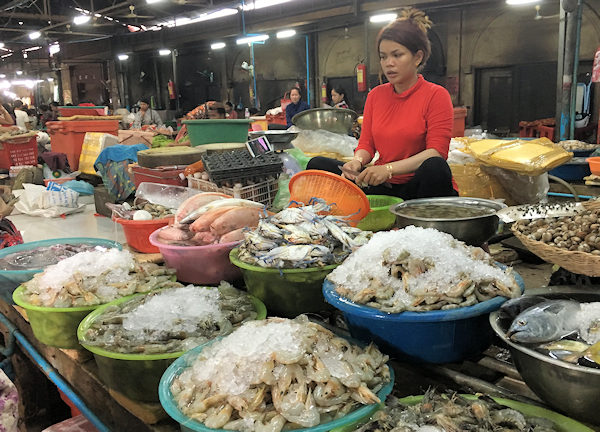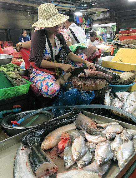 | マーケットの中の魚売場では台の上に商品が並べられ、お姉さんたちがあぐらをかいて店番をしています。東南アジアのマーケットではよく見る光景です。十数年前に初めてこの光景を見たときは驚いたものですが、よくよく考えてみると、中で立って店番をするより疲れないし、周りも見渡せますから合理的です。 |