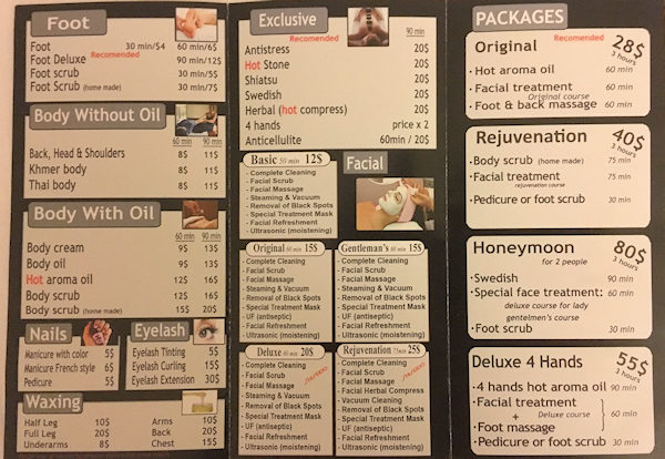 | この価格表はシェムリアップでもかなりの高級マッサージ店のものです。(2016年6月) ここでさえ、一時間US8でマッサージを受けられます。シェムリアップはマッサージ天国です。そして、高級店ですと腕の良いマッサージ師がいます。高級店でも下手なマッサージ師にあたってしまうことがあります。また、廉価な店でも上のお姉さんのように腕の良いマッサージ師もいる一方、ピンクマッサージばかり誘う不埒なマッサージ師もいます。 |