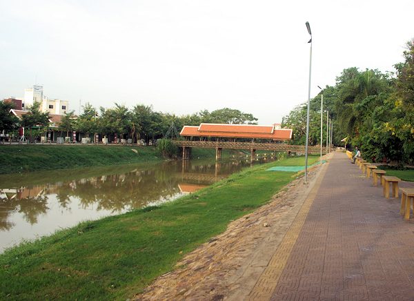 シェムリアップ川は川沿いに遊歩道が整備されていて、オールドマーケットから国道6号線まで歩いていけます。このオールドマーケット付近は綺麗に整備されてはいるものの、日影が少ないですから、朝と夕方以外は暑くて歩きづらいと思います。 |