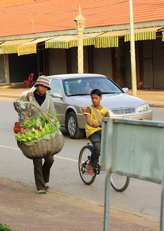 また、市場で花を買って運んでいる女性が歩いています。隣で自転車に乗っているのは息子さんでしょうか。朝、7時くらいのオールドマーケットの裏手のシェムリアップ川沿いの風景です。 |
