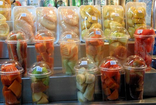 注文の仕方は簡単です。それぞれのカップに入っているフルーツをもとにジュースを作ってくれますので、何ジュースを飲むか決めて、お店の人に渡すだけです。バナナ、メロン、パパイヤ、スイカ、あるいはミックスといった色々なフルーツがありましたが、私はマンゴーを選びました。 造りたてのフレッシュジュースですから、美味しいこと、この上ないです。50バーツ、150円のジュースとしては上々の味です。 |