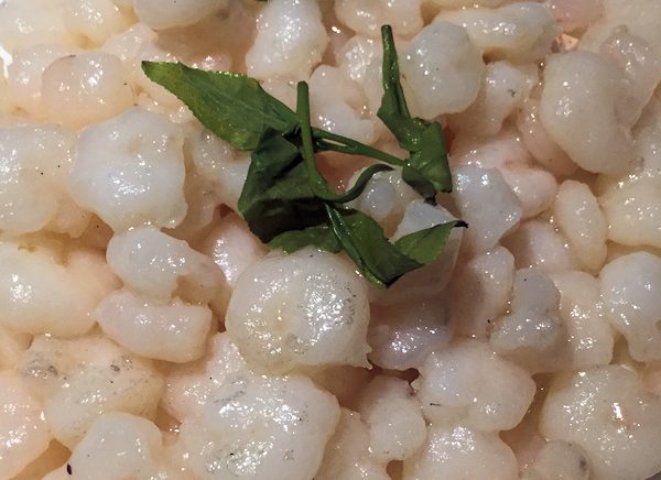 そして、いよいよ杭州酒家の看板料理というか、大人気メニューである悶騒南瓜という料理です。南瓜はカボチャのことで、悶の字には悶々とするという意味のほかに閉じ込められる意味もあります。 左側はピザパンのように見えますけれども、このピザパンの中にカボチャが閉じ込められているのです。ピザパン、カボチャ、そして中華料理という組み合わせに、まずは驚いてしまいます。さらに言えば、右側のポテトみたいなものもパンです。このパンをくりぬいたところにカボチャを入れてあるのでしょう。くりぬいたパンを軽くトーストしてその上にクリームを乗せています。 |