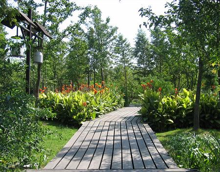こんな感じで木の歩道が水辺をつないでいます。真夏でしたが、コンクリートの道路を歩くのに比較すると、太陽の照り返しもなくずっと歩きやすいですね。やはり、自然が一番です。 茅家埠では、日の当たる場所、日陰の場所、河辺など、それぞれの自然環境に合った植物が自生している状態です。もちろん、杭州市が最低限の整備は行い、植物の自生を支援しています。 |