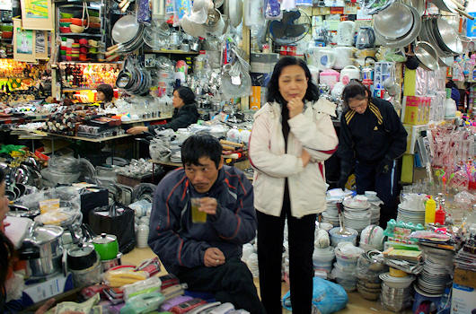 寝具屋の前でたむろして話し込んでいる若者たち。 大声でキャッキャ、キャッキャと騒いでいましたが、どうやらこの寝具店の店員だったようです。なんとものどかな売場風景です。 |