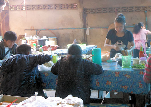 市場の中には食堂もあります。麺類を食べている人が多かったです。 |