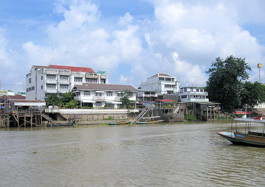 これがパサック川です。パサック川は渡し船で渡ります。上の写真の道を歩いて5分くらいで渡し船乗場に着きますし、渡し舟は適当にお客さんが集まると出発しますので、時間はかかりません。むしろ、アユタヤー駅から渡し舟に乗ってアユタヤー市街のチャオプロム市場に行くまでの風情も、タイ旅行らしくて嬉しくなってしまうものです。 |