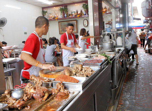 ヤワラーを歩くと、食いしん坊の私はどうしても食べ物屋台に目が行ってしまいます。勿論、食堂やレストランも沢山あります。上の写真はヤワラート通りにある人気の食堂。外に行列ができていました。麺類もあれば、 |