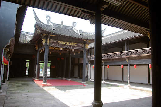 祖廟の中です。かなり広いスペースです。何も置かれてないので、ちょっと祖廟らしくないかなとは思いますが、建物の装飾は豪華です。 祖廟については、諸葛孔明の子孫が住む諸葛村に、諸葛一族の祖廟として、丞相祠堂や大公堂といった建物がありますので、興味がある人はご覧ください。 |