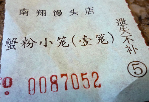 この店では、まず、食券を買います。実は、この日、どうせ南翔饅頭店には混んでいて入れないだろうと思って、飲茶の朝飯を食ってきたばかりです。仕方がないから、二人で蟹粉小籠包を一つ食べることにします。 |