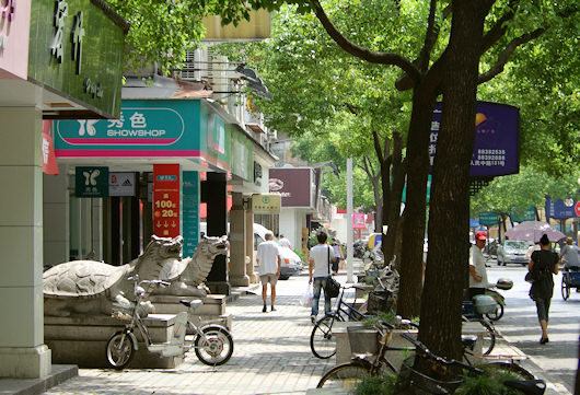 紹興で一番の繁華街は、解放路です。道路は、車道、二輪車等用の道路、歩道に分かれていて、かなり広いです。ここは、解放路の供銷ビルの前です。この付近は人通りの多い地区ですが、3時ごろの時間は、暑いせいか、人通りがあまり多くないですね。 それでは、ここから、歩いて越王殿に向かいますが、途中、府山横街を経由していきましょう。 |