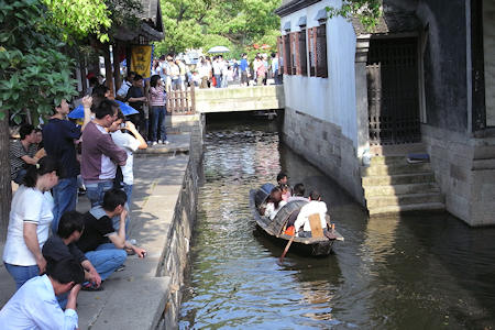 この三味書屋のあたりは観光客が多くてうっとうしいですが、こんな感じで烏篷舟に乗って運河をすすむと、ちょっと雰囲気がありますよ。 |