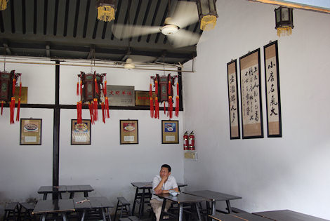 咸亨酒店の店内です。5月の労働節に来た時には、店内ばかりでなく、店の外まで人であふれていましたが、今回、7月下旬の土曜日に来てみましたら、意外にお客さんが閑散としています。 店内の飾りは、天井からぶら下がる灯りや何枚かの掛け軸はあるのですが、すっきりした感じです。このおじさんが茶碗で飲んでいるのが、紹興酒です。この店では、紹興酒をお椀で飲むスタイルです。 |