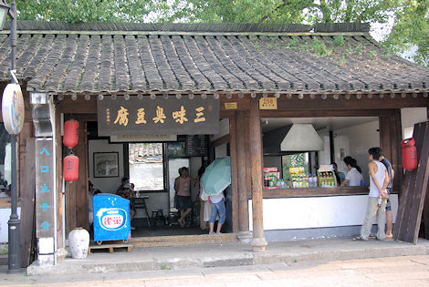 | 魯迅故居の中で次に目指すのは、三味書屋です。 が、その途中にあるのが、「三味臭豆腐」という店です。臭豆腐については、ご存知の方も多いと思いますが、独特の風味と強烈な臭気を持つ料理で、中国江南エリア、特に紹興では、名物の一つといってよいと思います。 初めてこの料理を見た日本人の10人中9人は、好きにならない料理だと思いますし、中国人でも好みが分かれると聞いていますが、慣れると旨いんです。実は私も、この臭豆腐のファンで、「紹興で絶対に食べなければならない料理リスト」に入っている料理です。 それが、ちょうど魯迅故居の中に「三味臭豆腐」などという専門店があって、しかも例の強烈な臭いを、この界隈に撒き散らしていて、思わず心が動きましたが、観光客向けの店のような気がしたものですから、パスしました。 |