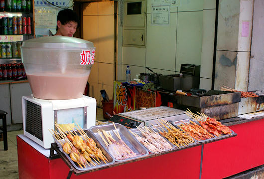 ホリデイイン・ジャスミン蘇州(蘇州茉莉花暇日酒店)の裏側には、食堂街もあって、庶民的な店や小吃店が軒を連ねています。串焼き屋もあれば、ザリガニを中心とした海鮮料理店、四川風鍋料理店、ラーメン屋さん等々、庶民的な料理であればこの通りにないものはありません。夕方から夜になると、この界隈は人であふれかえります。 |