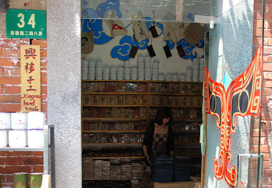 雑貨店の興穆手工です。文房具の品揃えが良く、革の手帳やメモ帳などの品揃えが豊富です。また、田子坊の色々な場所をデザインしたマウスパッドも扱っていて、私も愛用しています。 |