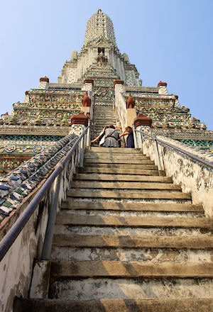 ワット・アルンの大きな仏塔は高さ75メートルあります。 この塔は上の方まで登ることができます。かなり急勾配ですので手すりにつかまりながら登ります。下りてくるときの方が階段を踏み外しやすいので注意しましょう。 |