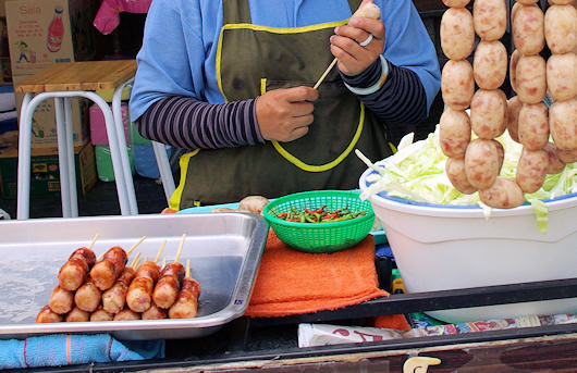 チェンマイ風のソーセージ、ネームを売る店です。もともとソーセージが好きな私としては、見逃せない食べ物です。 |