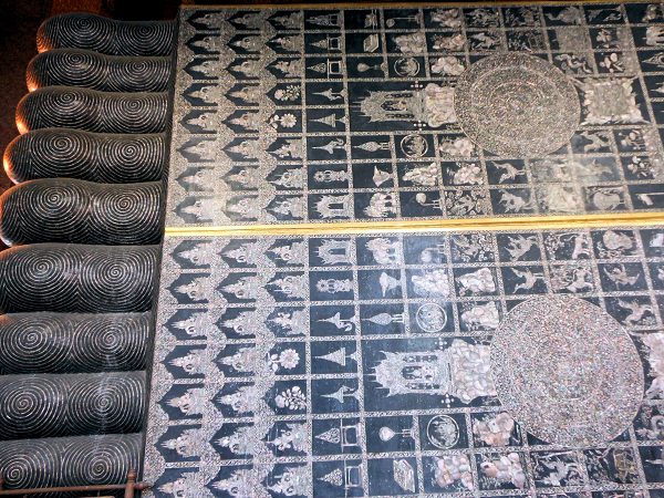 上の写真は寝釈迦の足の裏です。大きいですね。この足の裏だけでも、長さ5m、幅1.5mあります。足の裏に細かく描かれているのはバラモン教の宇宙観で、この足の裏を見ると寝釈迦仏の荘厳さをますます感じるようになります。 |