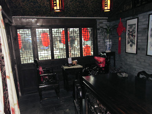 なかなか、この福聚堂という茶楼は、内装に凝っています。テーブル、椅子は、木彫りの入った中国家具、窓の格子にも木彫りが入っています。そして、壁側には、中国風の絵が飾られています。