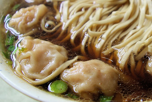 そして、こちらがおすすめ料理の海老ワンタンメンです。 ラーメンの類については、まずスープから味わうのが私の流儀です。鶏がらのスープの味がちょっと濃い目で、私としては嫌いではないスープです。麺はゴムのような弾力が感じられて、香港の面にちょっと似ているかなという感じです。旨いです。 |