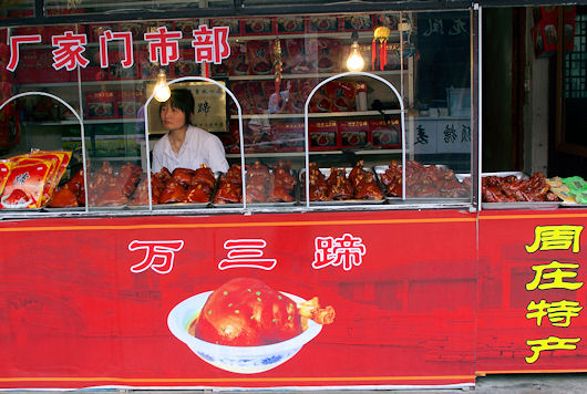 なかでも、周庄(周荘)古鎮での名物料理といえば、先ほども紹介した写真の万三蹄です。周庄(周荘)古鎮のあちこちで売られています。豚肉の脚の醤油煮込みです。見た目ほど脂っこくなく、私は好きな料理です。万三蹄の謂れを含め、詳しいことはこちらをご覧ください。 |