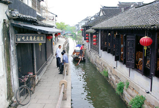 周荘(周庄)は上海、蘇州、杭州の間に位置している水郷古鎮で、歴史に周荘の名が初めて記されたのは1086年、まだ北宋の時代です。四方を水に囲まれ、目と鼻の先の場所へでも舟で移動しなければならず、河には舟がひしめき合っていたといわれています。古鎮の中も縦横に水路が走り、その水路を渡る橋が数多く造られています。水路に面して邸宅や倉庫が建ち並び、邸宅は水路から奥へと広がっています。 周荘古鎮は、陸上交通を主とする現代では不便な場所に位置しているため、開発から取り残されましたが、その結果、かつての街並みがそのまま保存され、いわゆる典型的な江南水郷のたたずまいを残しています。ユネスコの世界文化遺産にも登録されていて、その保存状態から「江南第一の水郷」と言われています。 |