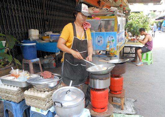 惣菜屋台だと作りたてのものが食べられないではないか、と言われる方のために、バンコクの屋台を少しご紹介しましょう。こういった屋台もたくさんありますから、どこで食べても良いのですが、惣菜屋台と同じように、地元の人が群がるような店を探すことが大切なことはいぅまてぜもありません。 上の写真はアソーク駅に近いソイにある屋台。出勤時間が終わり、店主がちょっとのんびりくつろいでいるところです。ここも事前にかなり混む人気店であることを調査済みです。 |