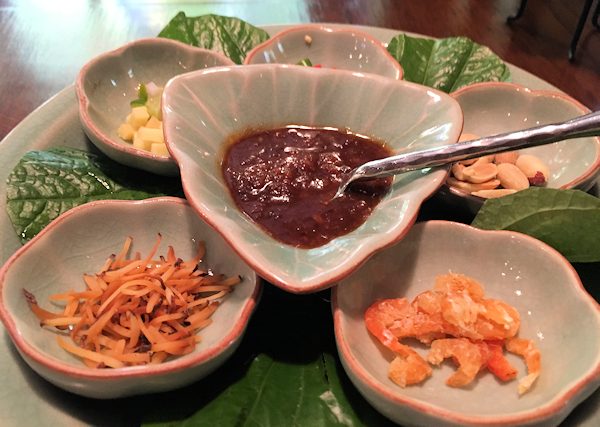 | 中国茶と一緒に、お店(バーンカニタ)からのサービスということで、タイ北部の前菜が運ばれてきました。この料理は、下に載せている1998年の記録でも出てきますが、チャプルーというタイ北部で栽培される辛い葉に、ピーナッツ、生姜、ライム、干し海老、干し魚、唐辛子、生姜、ライム、チーズやピーナツなどを乗せ、特製のタレをかけて、食べる料理です。 |