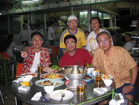 お店の正面にはシーフードの素材が色々並んでいます。どうしても目に入ってくるのがコレ。蟹です。土鍋に入れて春雨とともに蒸すプー・オブ・ウンセンにするのも好きですが、今日はバンコクにくるのが初めての人もいたので、定番のプー・パッポン・カレーにしてくれと頼みました。 あわせて、春雨の土鍋蒸しは蝦で作ってもらうように頼みました。蝦は旨そうなので、シンプルに焼いてもらうようにも頼みました。 この身勝手に注文しているときが、タイ料理の楽しさの一つですね。 |