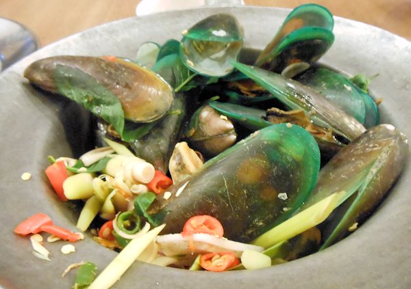 ミドリ貝を単純に蒸しただけの料理と紹介したのですが、よくよく見るとバジルやレモングラス、そして唐辛子で香りづけしていることがよく分かります。この味付け、香りつけがタイ料理らしさを出しています。 |