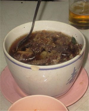 いくらガイヤーンの旨い店だからといっても、ガイヤーンだけ食ってビール飲んで帰ってくるのでは芸がないですから、スープを注文することにしました。しかし、この店、当たり前といえば当たり前ですが、英語は全く通じません。 で、隣のテーブルの人たちが飲んでいたものと同じものを注文しました。料理が来てみて分かったのですが、牛肉と野菜のスープでした。結構旨そうです。 |