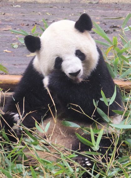 | ここ成都ジャイアントパンダ繁殖研究基地には150頭を超えるパンダが生息していますが、中でも人気が高いのが、アメリカのアトランタ動物園生まれの美蘭君です。2006年生まれですから私が行ったときは11歳でした。この美蘭君のどこが可愛いかというと、はっきり言ってかなりの食いしん坊だからです。どうですか? 上の写真の太い竹を手にして満足そうにしています。物干し竿みたいな竹を持っているんです。これを手に入れて満足そうな美蘭君なのです。 |