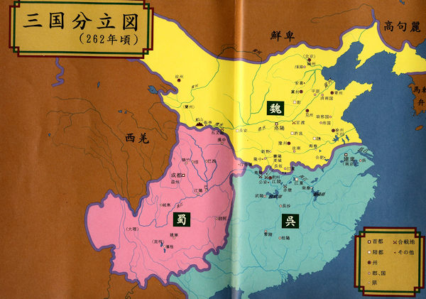 上の図は三国鼎立が成立したときの勢力図です。諸葛孔明の献策もあって、広大な中国を魏、呉と蜀が分け合う形になったわけです。蜀は都を成都に置き、今の四川省や雲南省方面を支配していたことになります。中国の気候・風土を知らない方は、蜀は山の中を支配しただけのように思えるかもしれませんが、実は成都を含め四川省という地域は海こそないものの、夏は暑すぎず冬も温暖で、天賦の地と言われるほど豊かな土地です。ですから、広さの面だけでなく豊かさの面でも三国鼎立が実現できる支配地域を持っていたわけです。 |