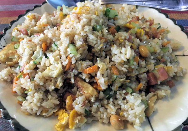 | 中国人からも酷評される桂林で食べるのですから、私もある程度覚悟はしていたのです。でも、チャーハンくらいなら食べられるだろうなどと甘く見ていた私がいけませんでした。 しかもこの日は広西風酸辣チャーハンを注文してしまったのです。中国のグルメサイトで最も味の評価が高いレストランで、「このチャーハンは地元の味ですよ」などと言われてその気になった私が浅はかでした。見るからに水分が飛んでないダメな炒飯の典型です。美味しいチャーハンというのは水分が飛んでないといけません。なのに、ここの炒飯は水分が飛んでないどころか、おじやのようにベチャベチャです。 |