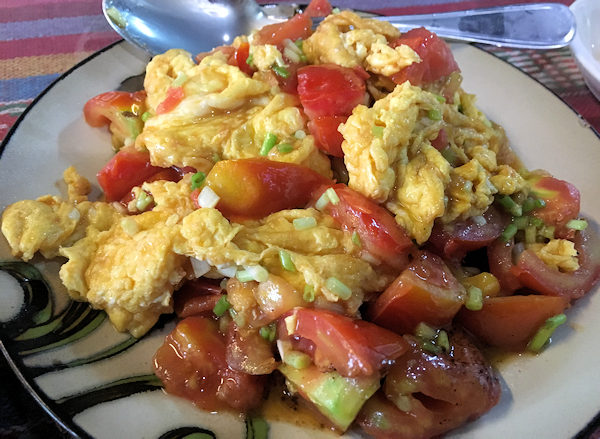 | もう一品は、これまた広東料理でよく出てくるトマトの卵炒めです。さすがにこれは玉子が使われていましたが、玉子を炒めすぎですよ。それに玉子がトマトに絡んでいないのです。これでは私が作るトマトの卵炒めより見栄えが悪いです。そして、さらに食べてみると、これが変に甘酸っぱいのです。全部同じ味付けです。この日の昼飯はひどい目に会いました。 |