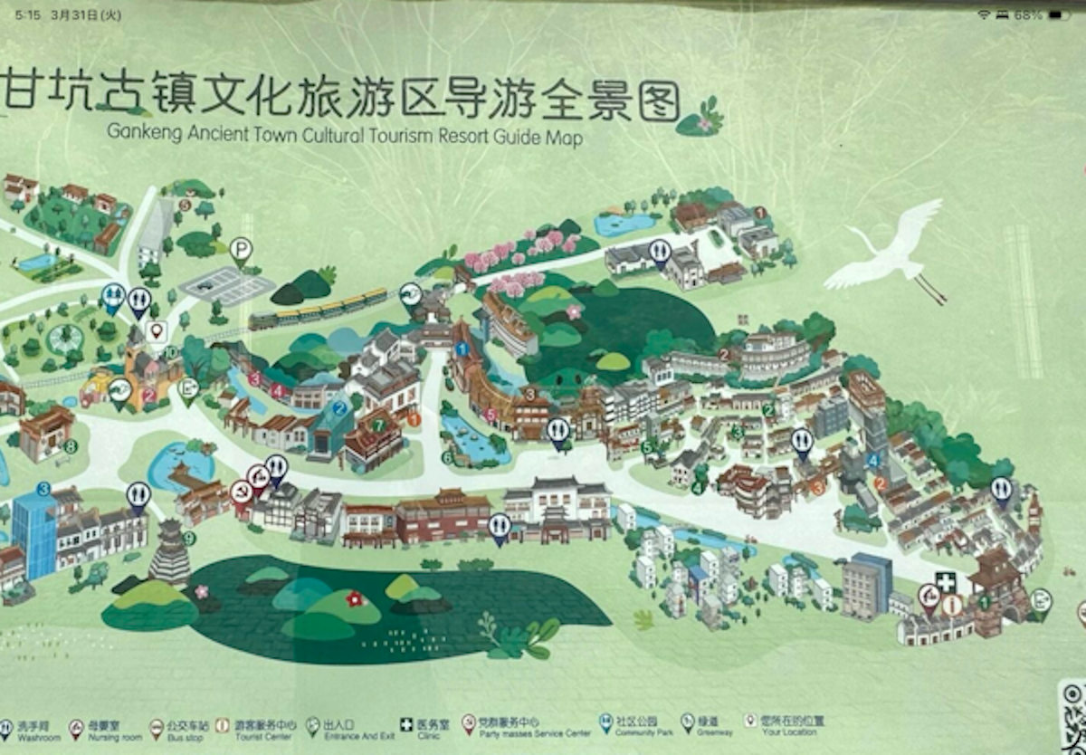 | では、甘坑古鎮の地図も参考にして、歩き方の説明に入ります。 最初に紹介した城門(地図では右下)をくぐってまっすぐに伸びる広い道を基準に、自分の位置を確認しながら歩けば良いと思います。古鎮の見どころは、この通りを歩いて上側に広がっています。 そして、日本人観光者にとって興味のあるスポットは、後に紹介する文昌塔のあたりまでの約500mのに沿って右側に広がっています。上の地図で言うと、左の下にある塔みたいな建物が文昌塔で、文昌塔の先にある池までが見学範囲だと思えば良いです。その先は子供連れの中国人客用のスペースです。子供連れで行かれるのなら、そうした場所にも行く価値はあると思います。 ですから、普通の日本人観光客であれば、広い通りの上のエリアを散策します。昔の街ですから、このエリアも道が入り組んでいて、自分の位置が分からなくなる人もいるかも知れません。そうなったら城門からの広い道に出るようにすれば、道に迷うことはありません。 |