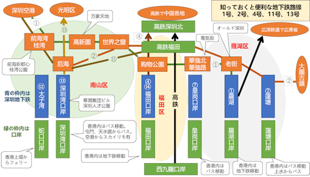| 要は、深圳というのは東西に長い静岡県のような市ですから、口岸から目的地への横移動が少ない方が時間的に楽なのです。上の図は地下鉄移動をベースに作りましたが、タクシーや網約車(滴滴など)で移動する場合も同じです。 |