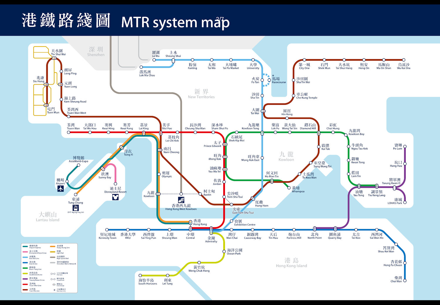 | 参考までに、香港MTRの路線図を載せておきます。深圳のおもな口岸への最寄り駅は次の通りです。 ①深圳 羅湖口岸 MTR羅湖 ②深圳 福田口岸 MTR落馬洲 ③深圳 皇岗口岸 MTR落馬洲(バス) ④深圳 深圳湾口岸 MTR天水圍または屯門(バス) ⑤深圳 文錦渡口岸 MTR上水(バス) ⑥深圳 蓮塘口岸 MTR上水(バス) 深圳湾に近い天水圍や屯門は地図の左上になります。 |