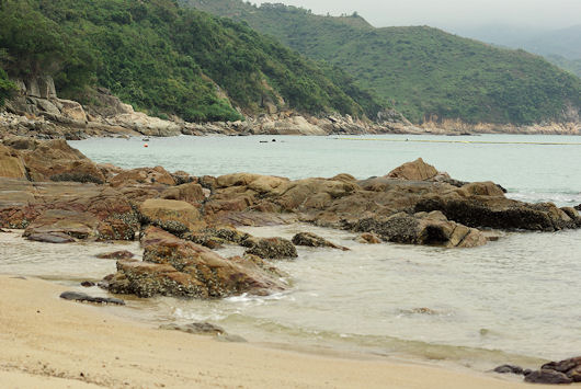 豆腐花の輝記は、榕樹湾と索罟湾を結ぶハイキングコースの途中にある洪聖爺ビーチのすぐ手前にあります。上の写真は洪聖爺ビーチです。香港らしくない風景ですね。夏は海水浴客も集まるビーチです。 |