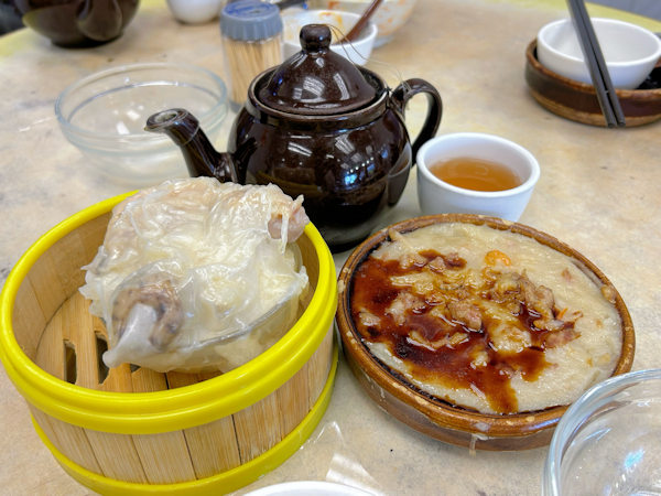 この日は二品食べ終わったところで、もう一品食べたいところですが、来たのはお粥のワゴンです。美味しい普洱茶を飲みながらもう少し待ってみましょう。 こうやってお茶を味わいながら待っている間も、茶楼ならではのディープな飲茶風景を楽しめます。 |