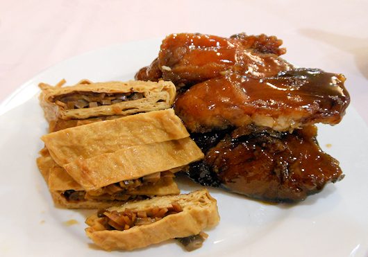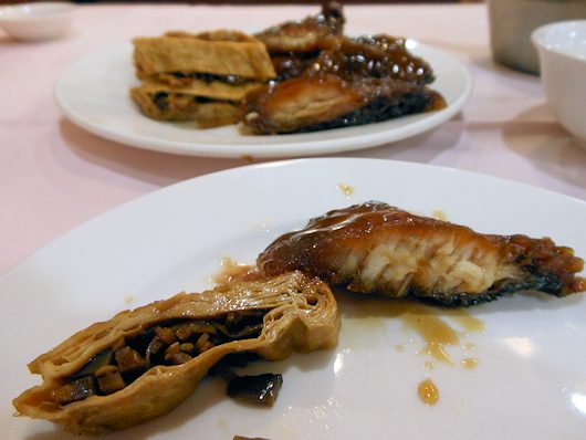 一品目は前菜の盛り合わせです。 薫魚とユバ巻です。それぞれ前菜として食べる料理ではありますが、私としてはてっきり鎮江肴肉あたりが出てくるものとばかり思っていました。薫魚とは魚の燻製ではなく、白身魚を揚げたうえで醤油ベースのタレに漬けたもので、佃煮の中国料理版みたいなもので、私は好きです。タレには八角などの香辛料が入っていると思うのですが、それが中国らしい味付けにしてくれているのです。 |